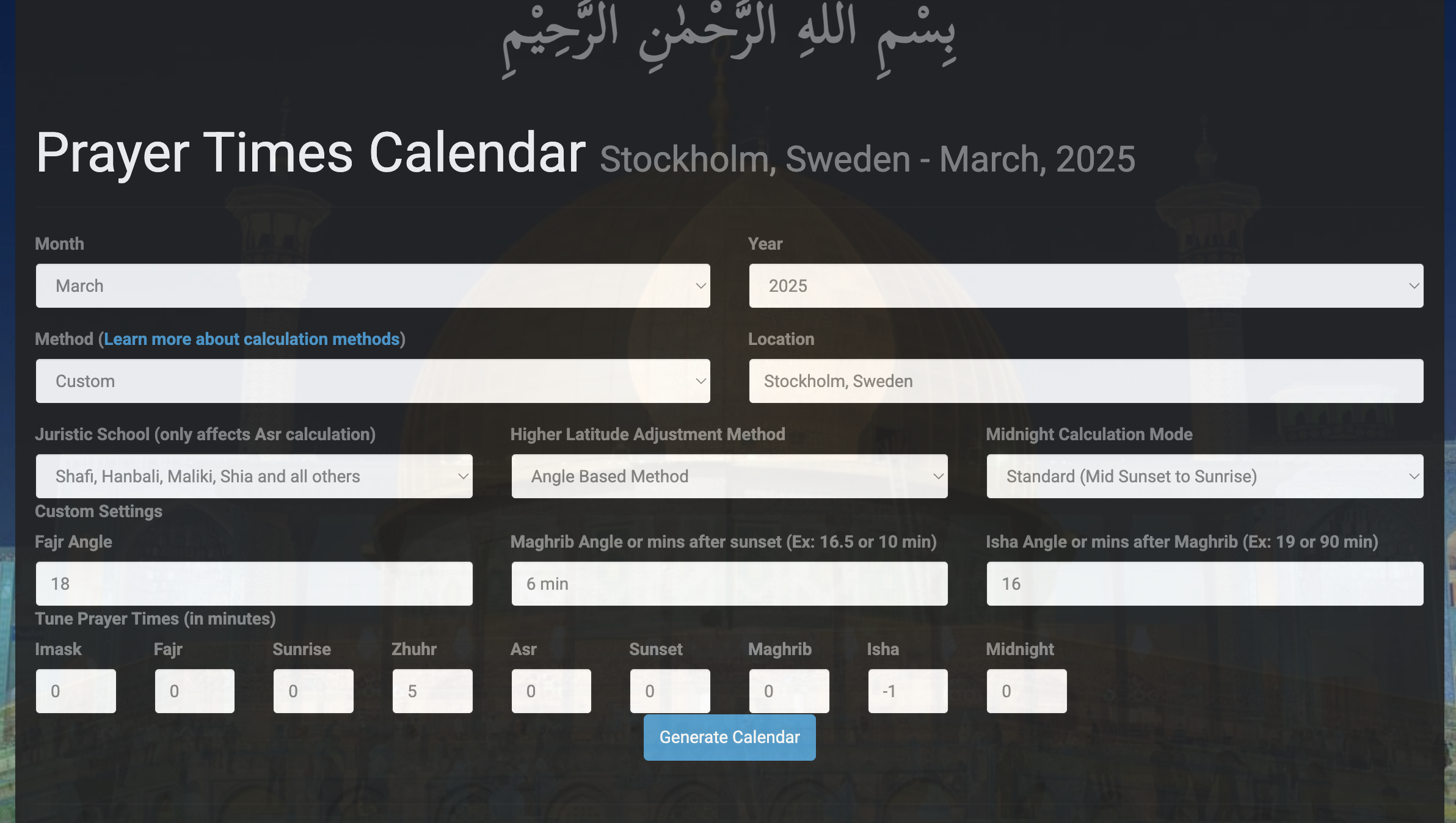 With the settings in the attached screenshot (which you can also use in the API), we are mostly within 1 min of the times on the islamiskaforbundet website.